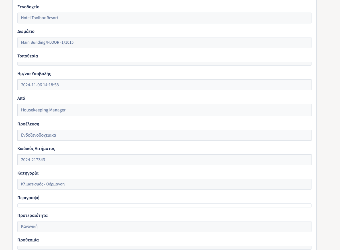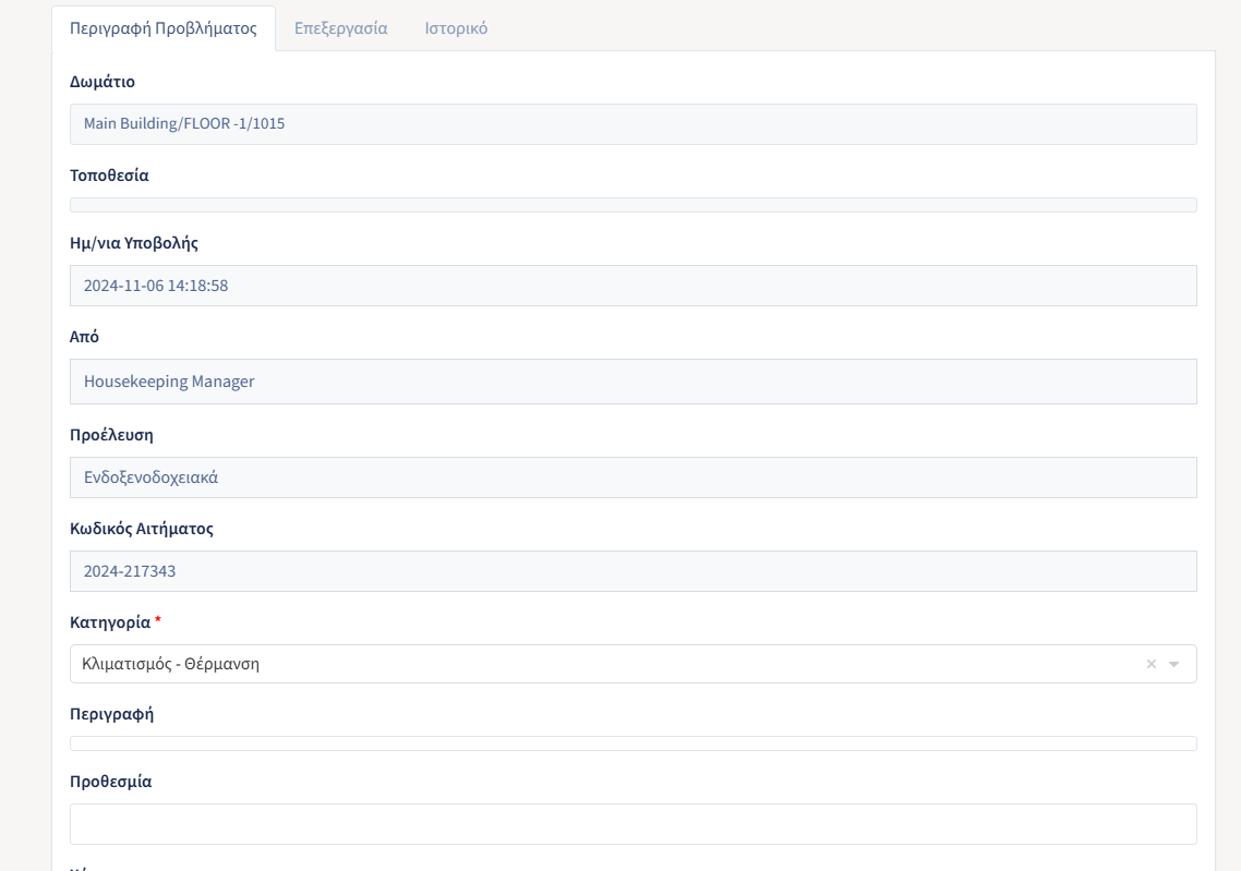 - Κατηγορία Προβλήματος: Μπορεί να αλλάξει την κατηγορία της βλάβης αν κριθεί απαραίτητο.