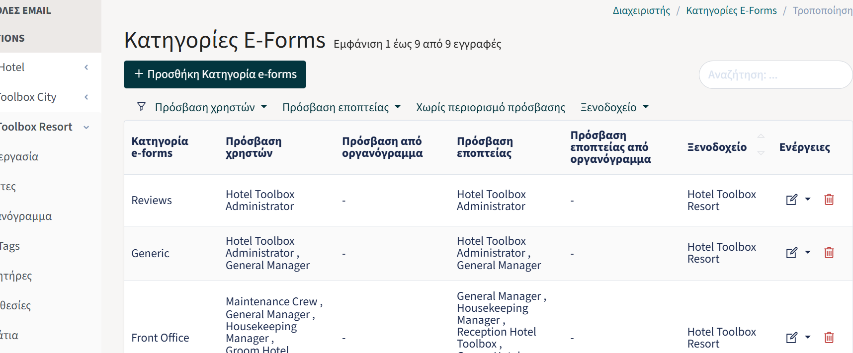- Τα e-Forms είναι ψηφιοποιημένες φόρμες συντήρησης και ελέγχου ανάλογα με το πόστο εργασίας. Μπορούν να χρησιμοποιηθούν στον υπολογιστή στο διαχειριστικό ή στο κινητό μέσω της εφαρμογής Hotel Toolbox.