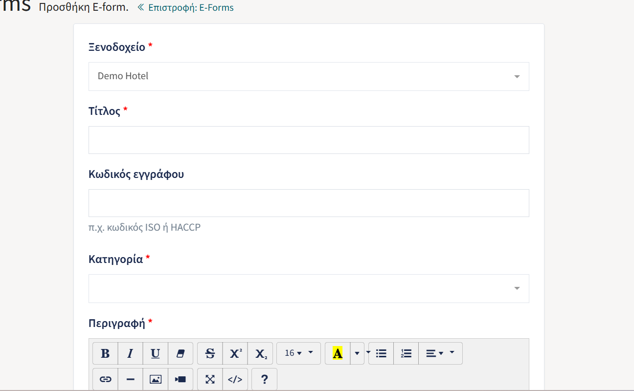 - Τίτλος: Συμπληρώστε τον τίτλο του e-Form (υποχρεωτικό).