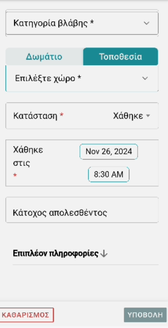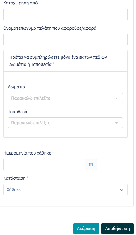 - Βρέθηκε και έχει αποθηκευτεί: Δηλώστε την τοποθεσία αποθήκευσης αν το αντικείμενο βρέθηκε και φυλάσσεται.