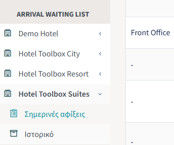 - Το Arrival Waiting List χρησιμοποιείται σε συνδυασμό με το Housekeeping module του Hotel Toolbox. Εξασφαλίζει τη σωστή παρακολούθηση των αφίξεων και της κατάστασης των δωματίων.