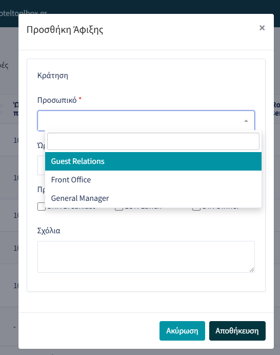 - Πατώντας το εικονίδιο ρολογιού δίπλα στο όνομα του πελάτη, μπορείτε να προσθέσετε περισσότερες λεπτομέρειες σχετικά με την άφιξή του.