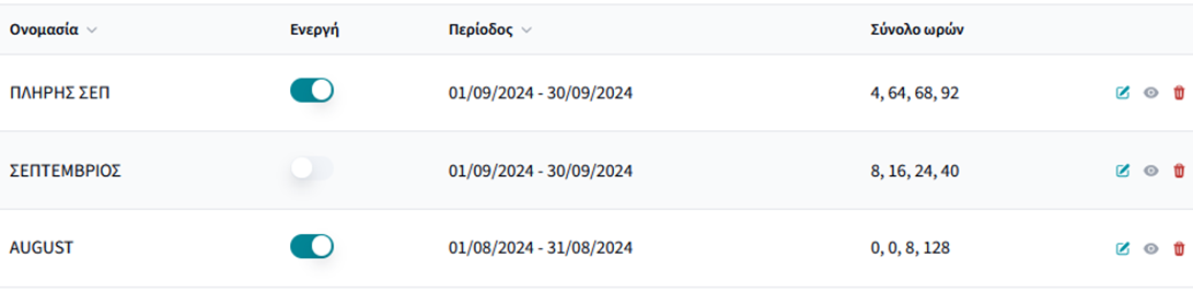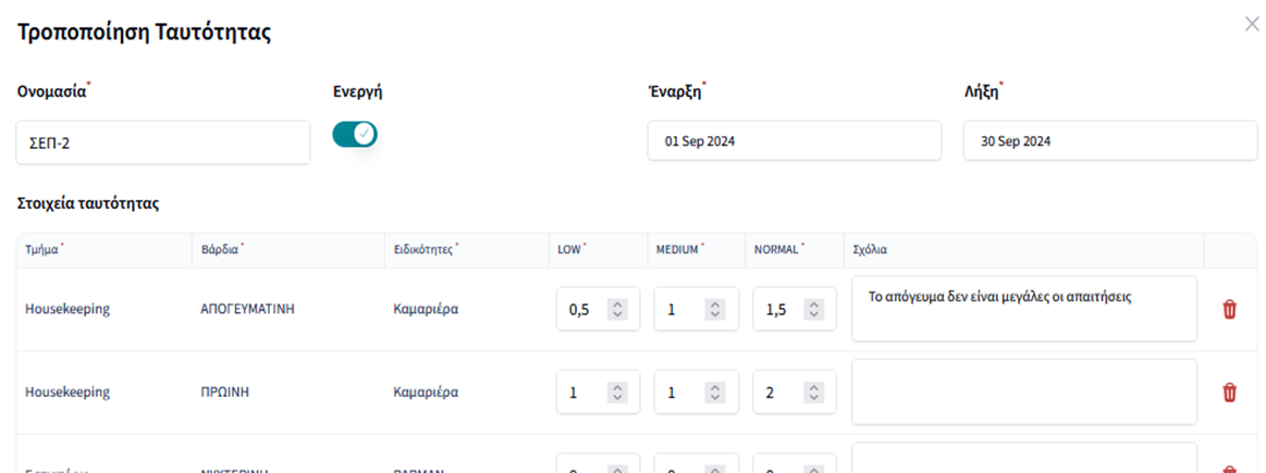 Κάθε ταυτότητα έχει ονομασία και ημερομηνία έναρξης και λήξης και μπορεί να μαρκαριστεί ως ενεργή. Κατά τον προγραμματισμό προσωπικού επιλέγεται αυτόματα η ενεργή ταυτότητα για την ημερομηνία προγραμματισμού, για το λόγο αυτό δεν επιτρέπεται δύο ταυτότητες με επικαλυπτόμενη περίοδο να είναι ταυτόχρονα ενεργές.