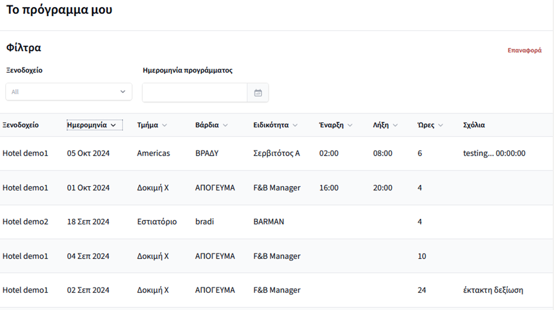 Η ενότητα αφορά όλους τους υπάλληλους με ρόλο «Χρήστης προγραμματισμού προσωπικού» και εμφανίζει σε πινακοποιημένη μορφή τον επερχόμενο προγραμματισμό. Κατά προεπιλογή η σελίδα εμφανίζει τον προγραμματισμό από την τρέχουσα ημερομηνία μέχρι και επτά ημέρες μπροστά.