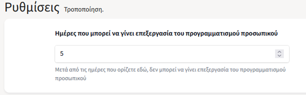 Η ρύθμιση αφορά το αυτόματο κλείδωμα του προγραμματισμού προσωπικού, τόσες ημέρες μετά από την ημερομηνία που αφορά, όσες καταχωρίζονται εδώ.