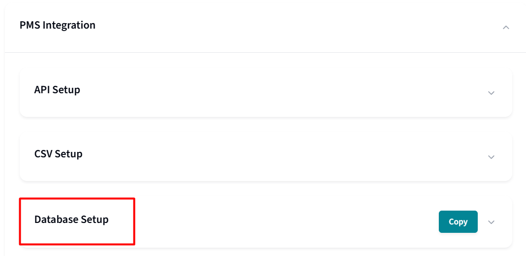 - Πατάμε τροποποίηση στο ξενοδοχείο που θέλουμε να σετάρουμε και πάμε στην ενότητα PMS Integration και ανοίγουμε το Database Setup: