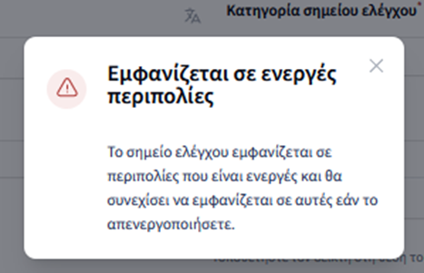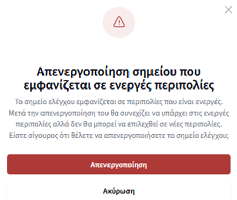 Μόνο τα ενεργά σημεία ελέγχου είναι επιλέξιμα κατά την επεξεργασία μιας περιπολίας/επιθεώρησης. Εάν ένα σημείο ελέγχου απενεργοποιηθεί ενώ έχει εισαχθεί σε μια περιπολία/επιθεώρηση δεν καταργείται από αυτήν. Σχετική ενημέρωση εμφανίζεται σε confirmation dialog και όταν ο διαχειριστής επιχειρήσει να απενεργοποιήσει ένα σημείο ελέγχου καθώς και στην οθόνη επεξεργασίας.