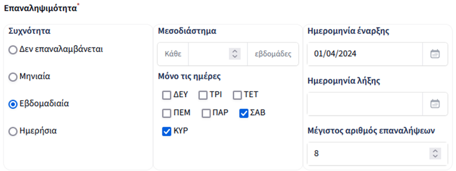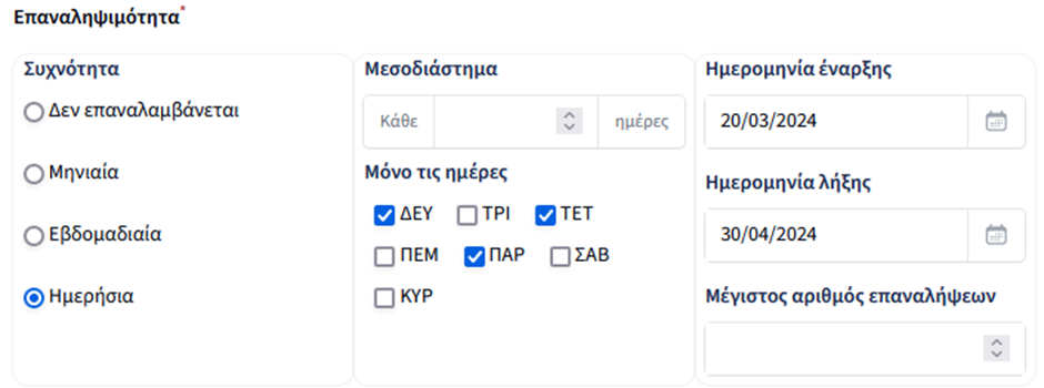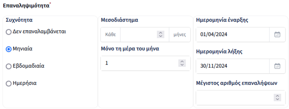 - Επιλέγεται συχνότητα εκτέλεσης (Δεν επαναλαμβάνεται, Μηνιαία, Εβδομαδιαία, Ημερήσια)