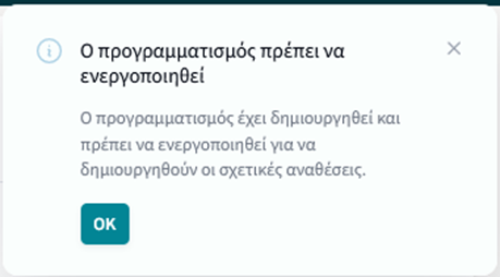 Μετά από τη δημιουργία ενός προγραμματισμού παρέχεται σχετική υπενθύμιση για την ενεργοποίηση του.