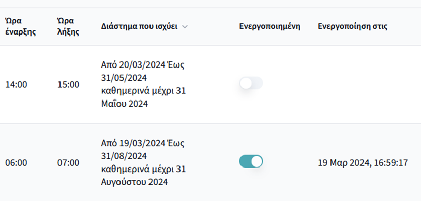 Όταν ο προγραμματισμός ενεργοποιηθεί και έχουν δημιουργηθεί με επιτυχία όλες οι αναθέσεις, θα εμφανιστεί το toggle με πράσινο χρωματισμό και δίπλα η χρονοσφραγίδα ενεργοποίησης.