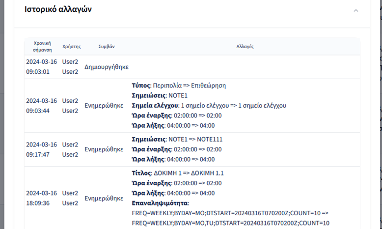 Η οθόνη λεπτομερειών του προγραμματισμού εμφανίζει και σύντομο ιστορικό αλλαγών.