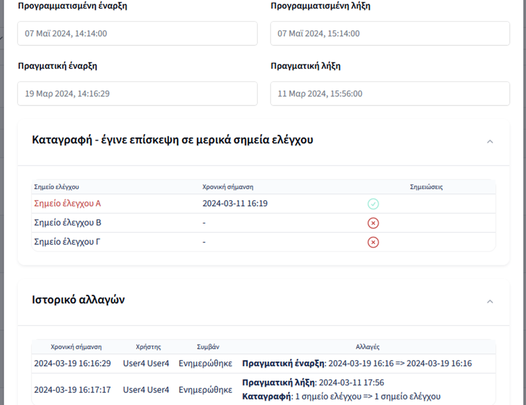 Στην οθόνη προβολής των στοιχείων της ανάθεσης εμφανίζονται όλες οι συσχετιζόμενες πληροφορίες μαζί με ένα σύντομο ιστορικό ενεργειών. Στην ενότητα «Καταγραφή» εμφανίζονται τα σημεία ελέγχου, χρονική σήμανση ελέγχου καθώς και εικονίδιο εάν ο έλεγχος ήταν ΟΚ. Τα σημεία ελέγχου με κόκκινο χρώμα είναι είτε ανενεργά είτε διαγραμμένα. Ο τίτλος της ενότητας «Καταγραφή» επίσης φέρει λεκτική ένδειξη εάν δεν έγινε έλεγχος (δεν υπάρχει χρονική σήμανση) σε όλα τα σημεία ελέγχου. Μετά τη χρονική σήμανση υπάρχει εικονίδιο το οποίο δείχνει εάν ο έλεγχος ήταν ΟΚ.