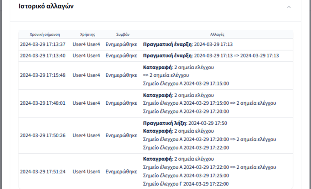 Στο παρακάτω παράδειγμα φαίνονται αλλαγές στη χρονική σήμανση επίσκεψης σε κάθε σημείο ελέγχου. Πρακτικά θα υπάρχει μόνο μία σήμανση αλλαγής στη χρονοσφραγίδα επίσκεψης σε κάθε σημείο ελέγχου.