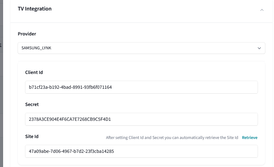 Αφού ολοκληρωθεί η διασύνδεση, θα πρέπει να έχουμε ζητήσει από την Samsung (Μαριλένα Ψαρολογάκη, info@axus.gr, 2811103185), τα στοιχεία Client ID και Sercret ώστε να τα συμπληρώσουμε στο ξενοδοχείο από το διαχειριστικό.