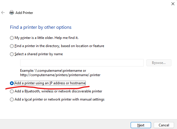 Στο επόμενο proompt επιλέγουμε tcp ip και βάζουμε την ip του εκτυπωτή που δηλώσαμε στα πρώτα βήματα. (δεν προσθέτωscreenshot για ευνόητους λόγους)