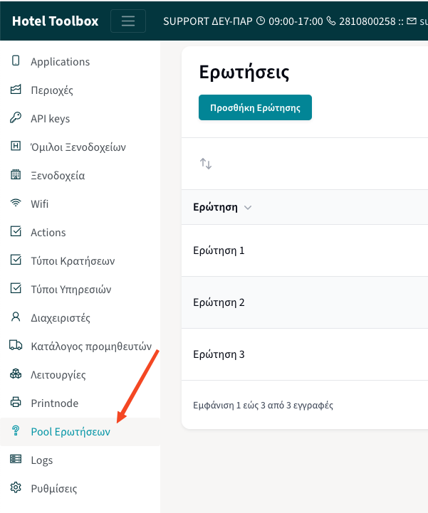 Σαν superadmin υπάρχει ενότητα Pool Ερωτήσων στην οποία προσθετουμε globally ερωτήσεις που μπορει να διαλέξει ο κάθε διαχειριστής όταν φτιάξει νεο ερωτηματολόγιο τύπου feedback